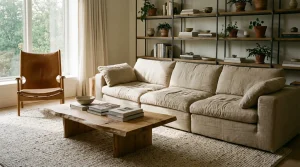 - Le beige sable : Il adoucit la rigueur du gris foncé en apportant une note naturelle.